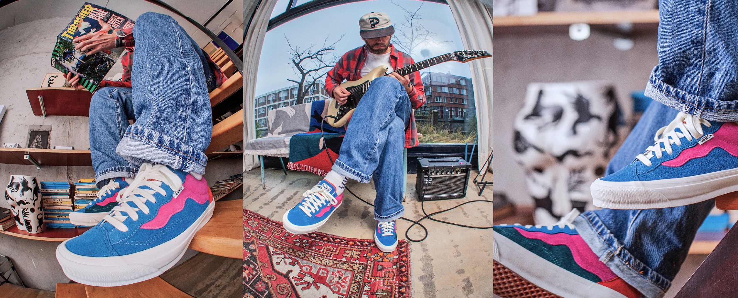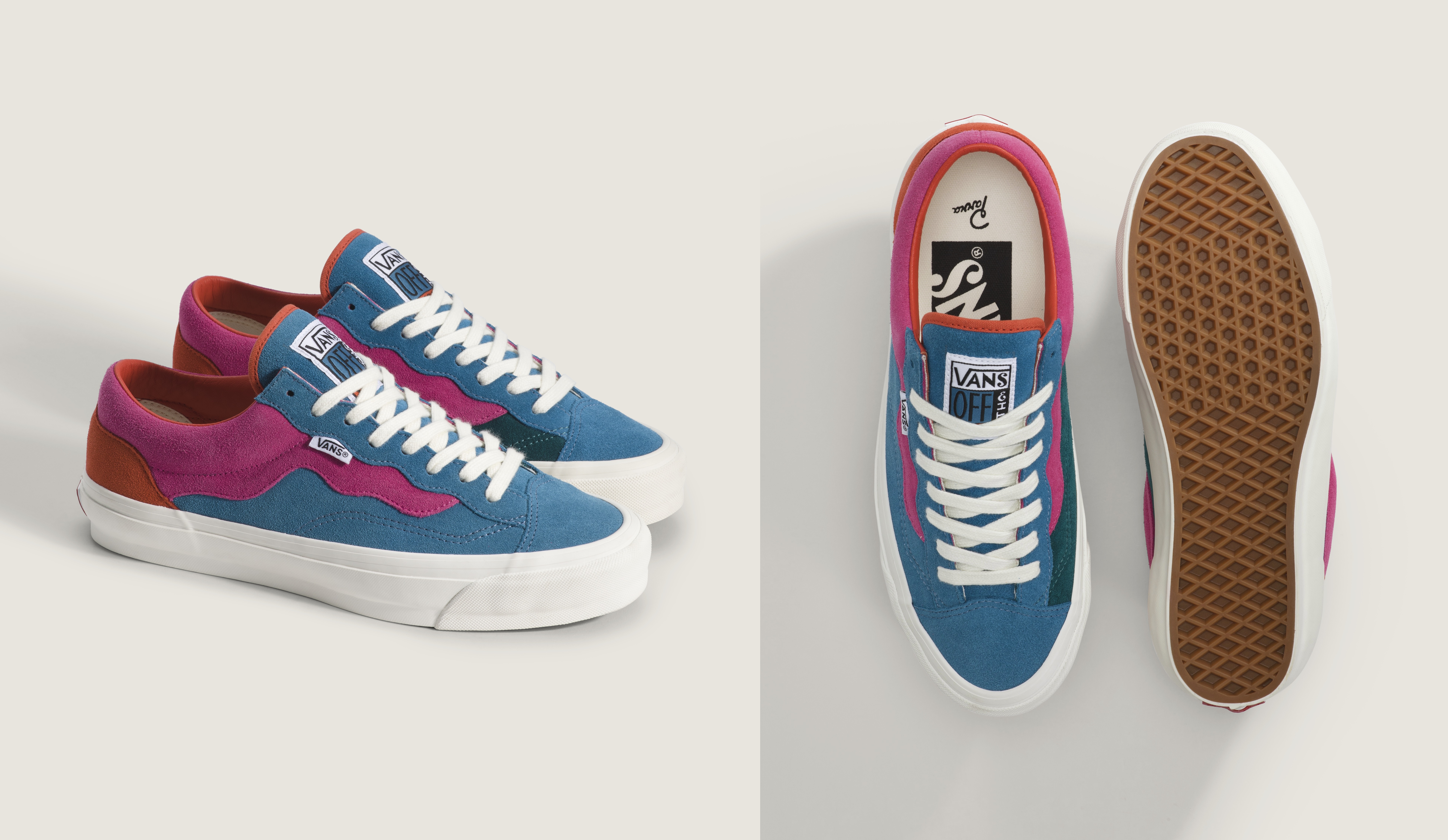 이번 스타일은 부드러운 스웨이드 소재에 파라의 시그니처인 웨이브 컬러 블로킹과 비대칭 디테일을 더해 미니멀하면서도 정제된 인상을 완성했다. 커스텀 텅 라벨과 좌우가 다른 풋베드 전반에는 위트 있는 타이포그래피를 적용해 개성을 더했으며, “Don’t forget to skate in these.”라는 문구로 스케이트보딩의 본질을 상기시켰다.